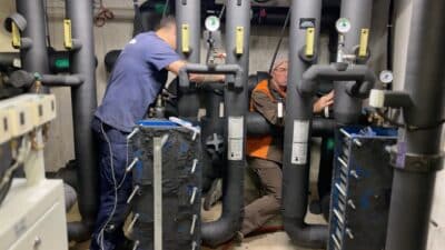 Shortly after moving into the new building, Aeschbach began experiencing declining performance in its geothermal installation. Flow rates gradually dropped. Heat exchanger efficiency fell. When plate heat exchangers were opened for inspection, technicians discovered what Rogenmoser describes as a “thick reddish sludge” – caused by iron bacteria.